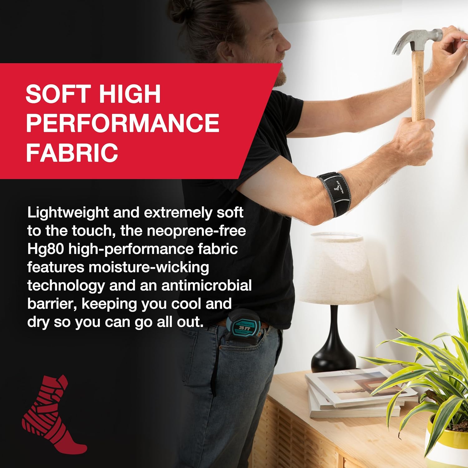 TARGETED COMPRESSION: Our Hg80 Premium Tennis Elbow Support Strap delivers compression to alleviate pain and discomfort, perfect for activities that exert pressure on the forearm and elbow