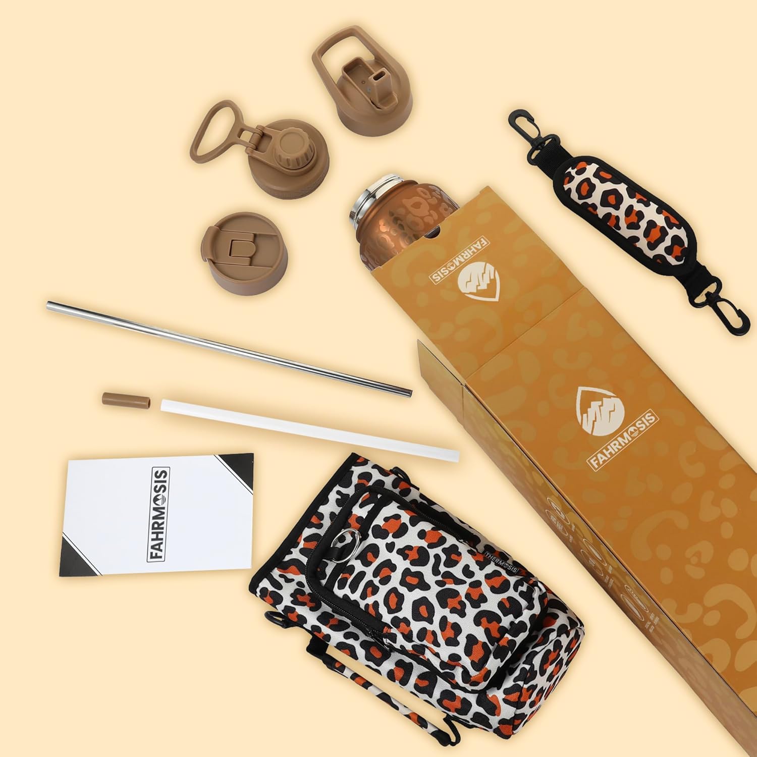 40 Oz Water Bottle with Strap Stainless Steel Sports Water Bottle with 3 Lids (Straw, Chug and Flip Lid) Insulated Leak Proof Metal Jug for Men & Women – Gold Leopard