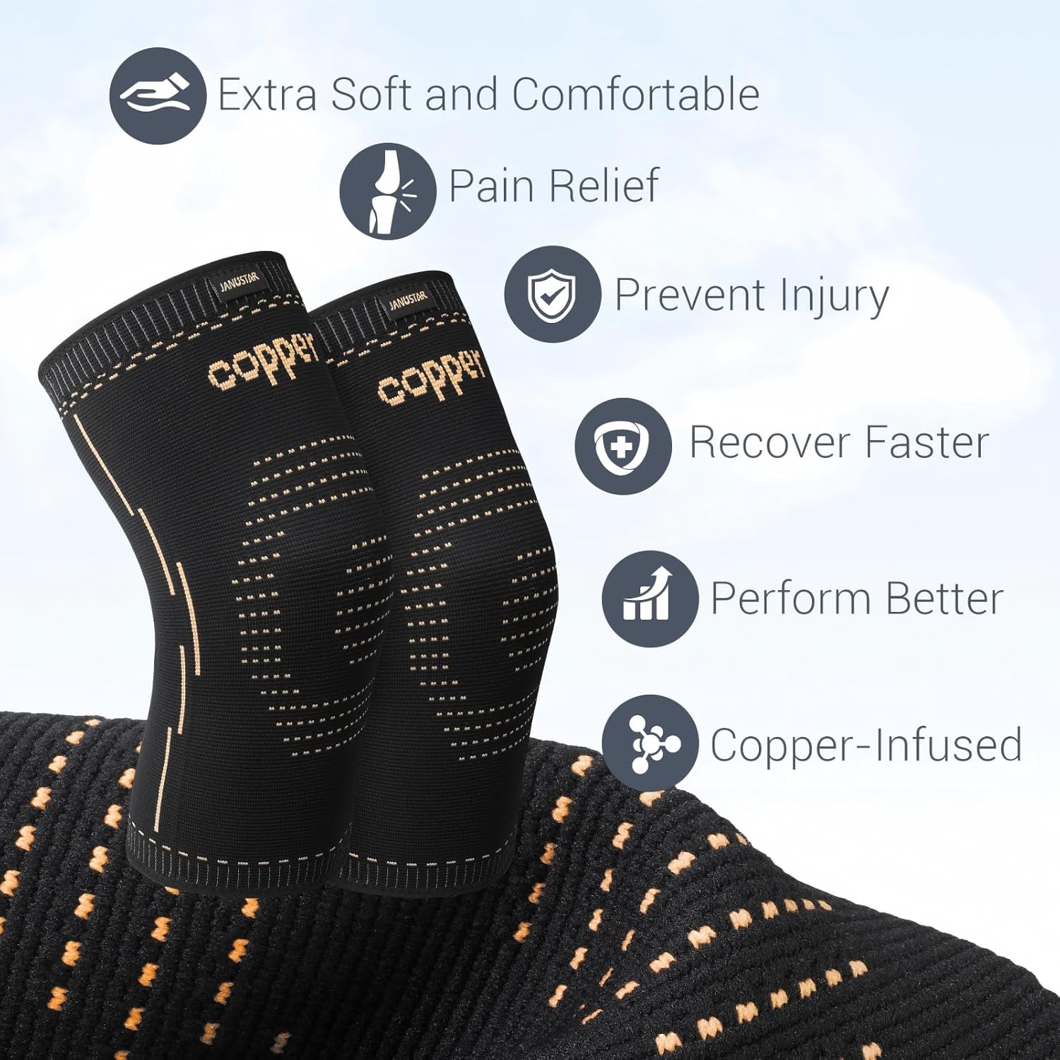 Versatile Support for Active Lifestyles: Designed for both men and women, our copper-infused knee braces provide reliable relief for knee pain, arthritis, and injury recovery. Perfect for everyday use—whether you’re working on your feet, walking, or staying active with sports like hiking, running, basketball, cycling, or gym workouts. Even seniors can enjoy the comfort and support! Each pack includes two sleeves, so you’ll always have a spare ready.