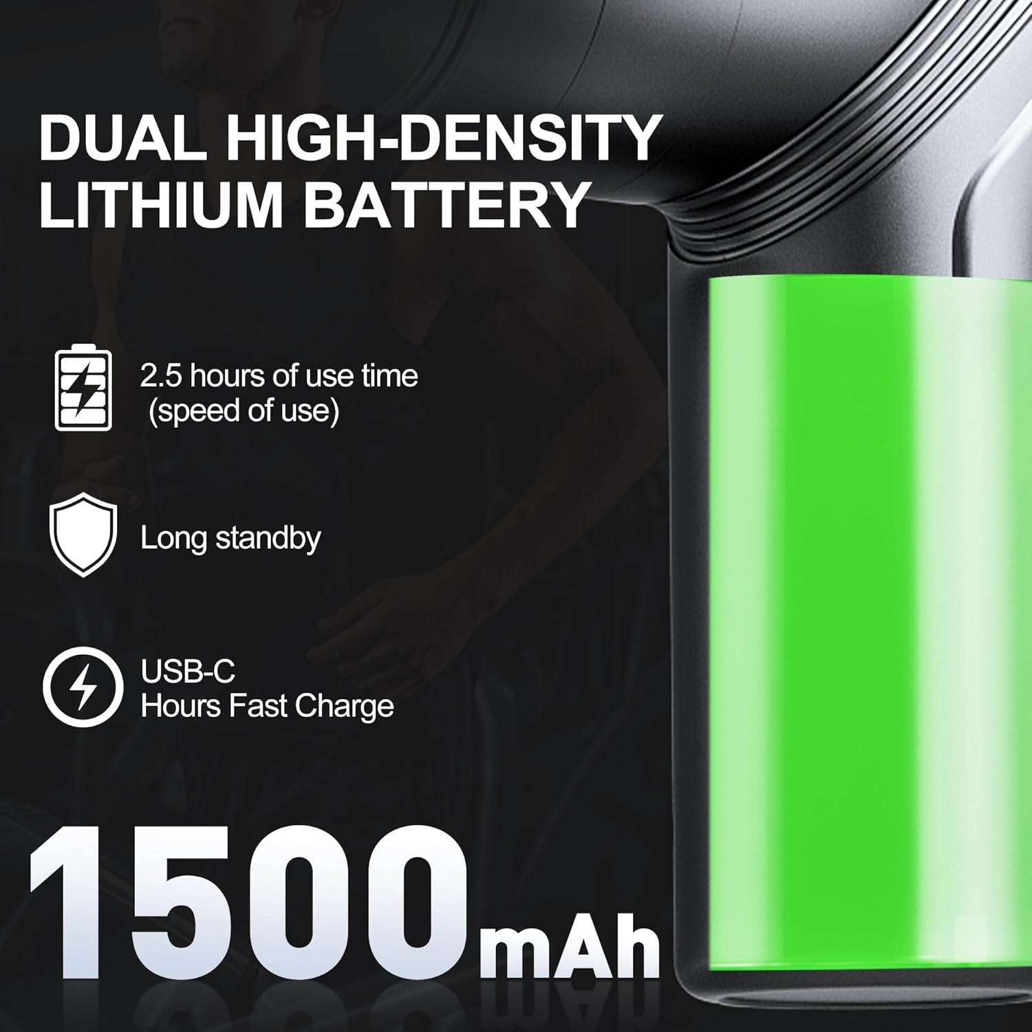 【Super Powerful Battery】The impact muscle massage gun is specially designed with a high-density lithium battery. 1500mAh large-capacity battery, with USB-C portable charging cable, allows you to charge at home or in the car and use it at any time
