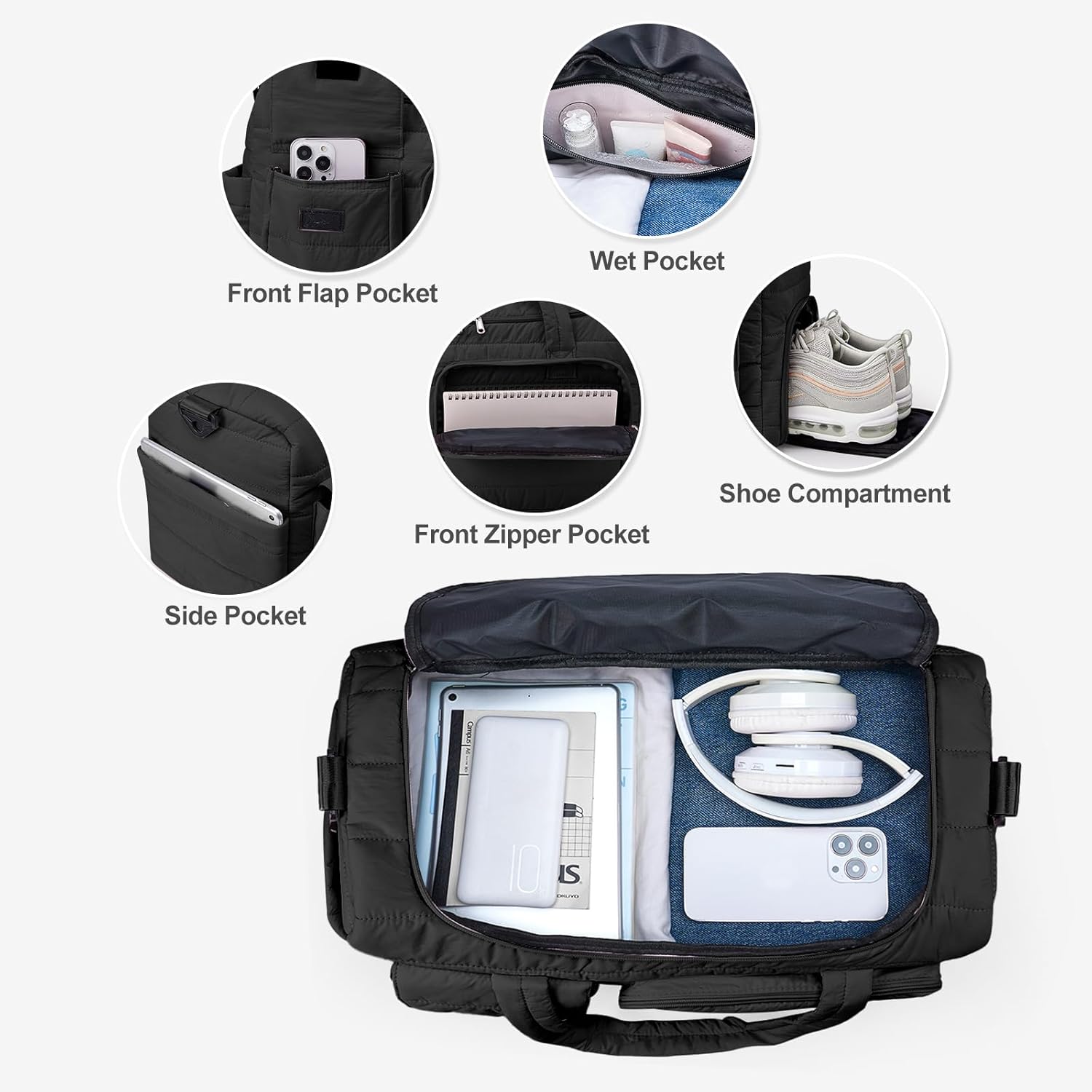 This is a very well-designed and stylish travel duffel that I’m genuinely excited to start using. Based on the size and shape, it should be able to fit under an airline seat or in an overhead bin when not overpacked. The capacity feels right for a 3–4 day trip, and the layout is practical and easy to use.The wet pocket is useful but fairly small. It realistically fits one damp swimsuit or some toiletries. It does a good job of keeping moisture separated from the rest of the bag, but it’s best viewed as a compact wet compartment rather than a large one.I also really like the number of exterior pockets, which make it easy to organize smaller items and have quick access if I need to get something.The puffy, quilted fabric is very cute and chic, and the black color gives the bag a stylish, classy look. Despite the soft appearance, the bag feels high quality and durable. The zippers, straps, velcro, and hardware all seem well made. The handles are comfortable, and the shoulder strap is adjustable. I’m tall, and it fits well.The trolley sleeve on the back is a great feature and makes it easy to use with a rolling suitcase.My only drawback is the shoe compartment. I like having a separate space for shoes, but it takes away from the main clothing compartment rather than expanding outward. I understand why it’s designed this way, but it does limit packing space if you have big feet like me. But, it’s not their fault that I have giant feet, but just keep this in mind if you have a giant feet and also like to pack a lot.Overall, the quality of this bag is excellent. It’s lightweight, durable, stylish, and very functional. I would still highly recommend it for travel, gym use, or weekend trips.