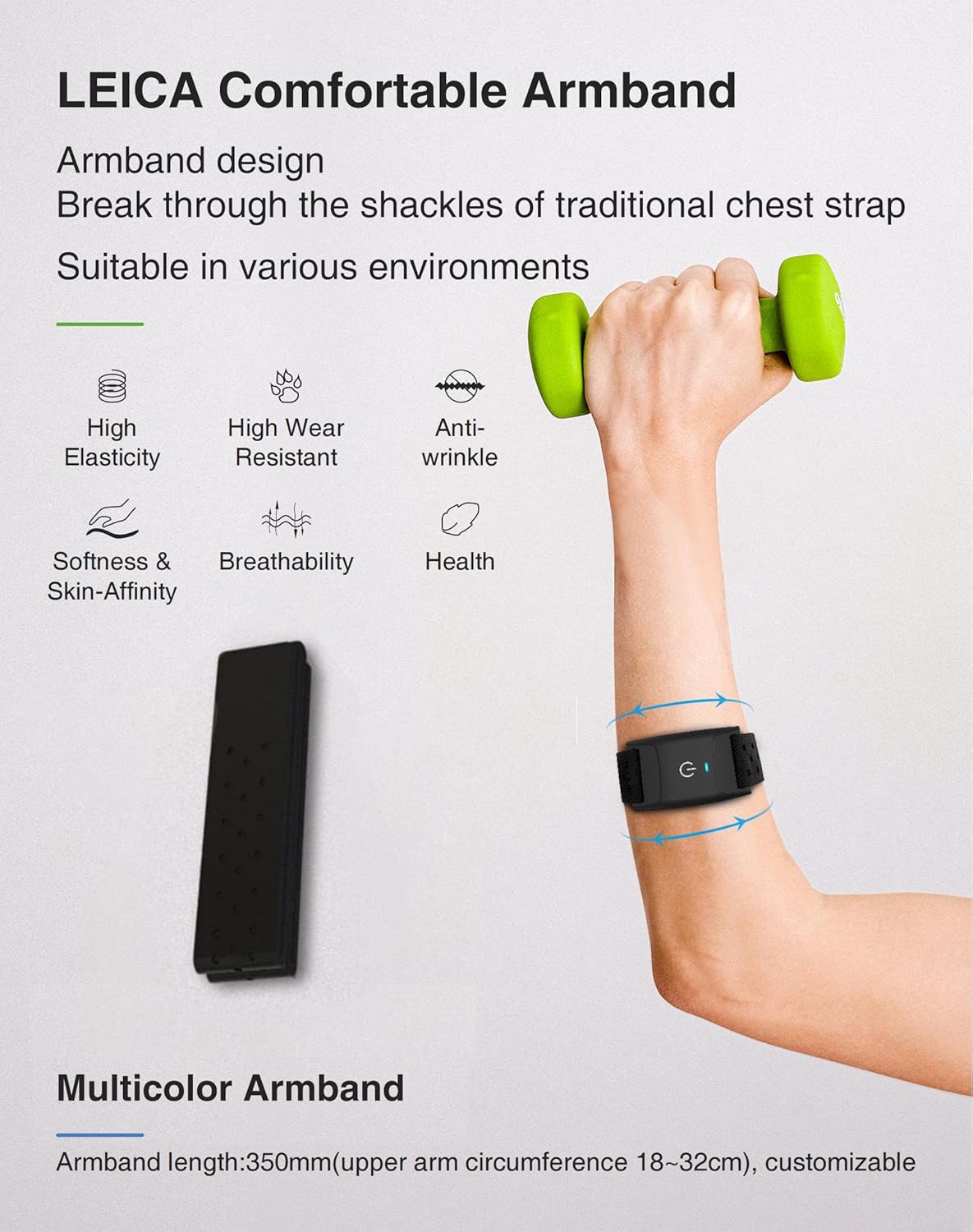 Optimal wearing style: The cycling heart rate monitor is recommended to wear it on the upper arm, forearm, and near the elbow joint, with a comfortable fit. Made of soft, breathable material and an adjustable strap, it ensures a secure and comfortable fit. The armband’s 35cm length accommodates a wide range of body shapes and sizes, and weighs 13g. It’s a comfortable, stress-free fit and keeps the running heart rate monitor securely in place.