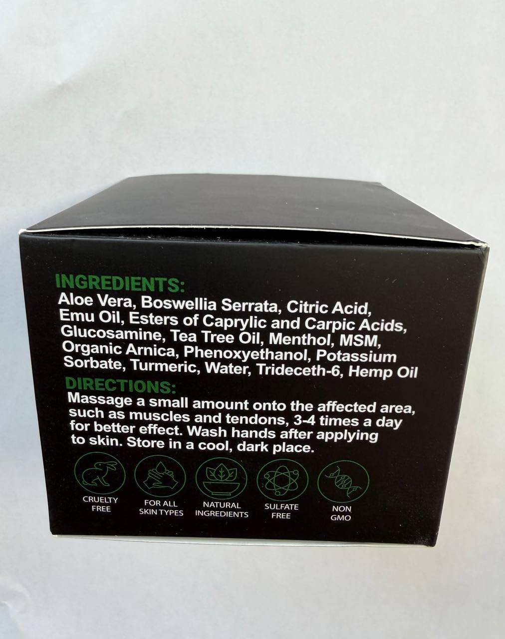 This cream really helps a lot .If you put it on your sore spot remember to put it on the bottoms of your feet and put socks on. It really helps a lot. I thought my friend was silly about that, but it really does work and the soreness goes away. If I could afford it, I would buy three bottles so I could have a massage with this. It is that good. It has emu oil in it this helps to absorb quickly..That helps your muscles as well it also cuts the ache.