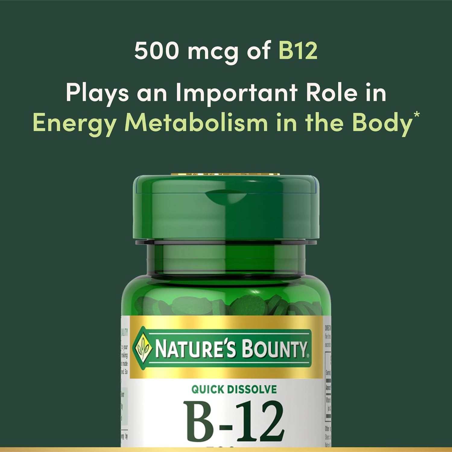 FOR ENERGY 100-count Vitamin B-12 500mcg Tablets; Nature’s Bounty Quick Dissolve B-12 vitamins play an important role in energy metabolism in the body(1); They help the body convert food into the fuel which is used to produce energy in the body(1)