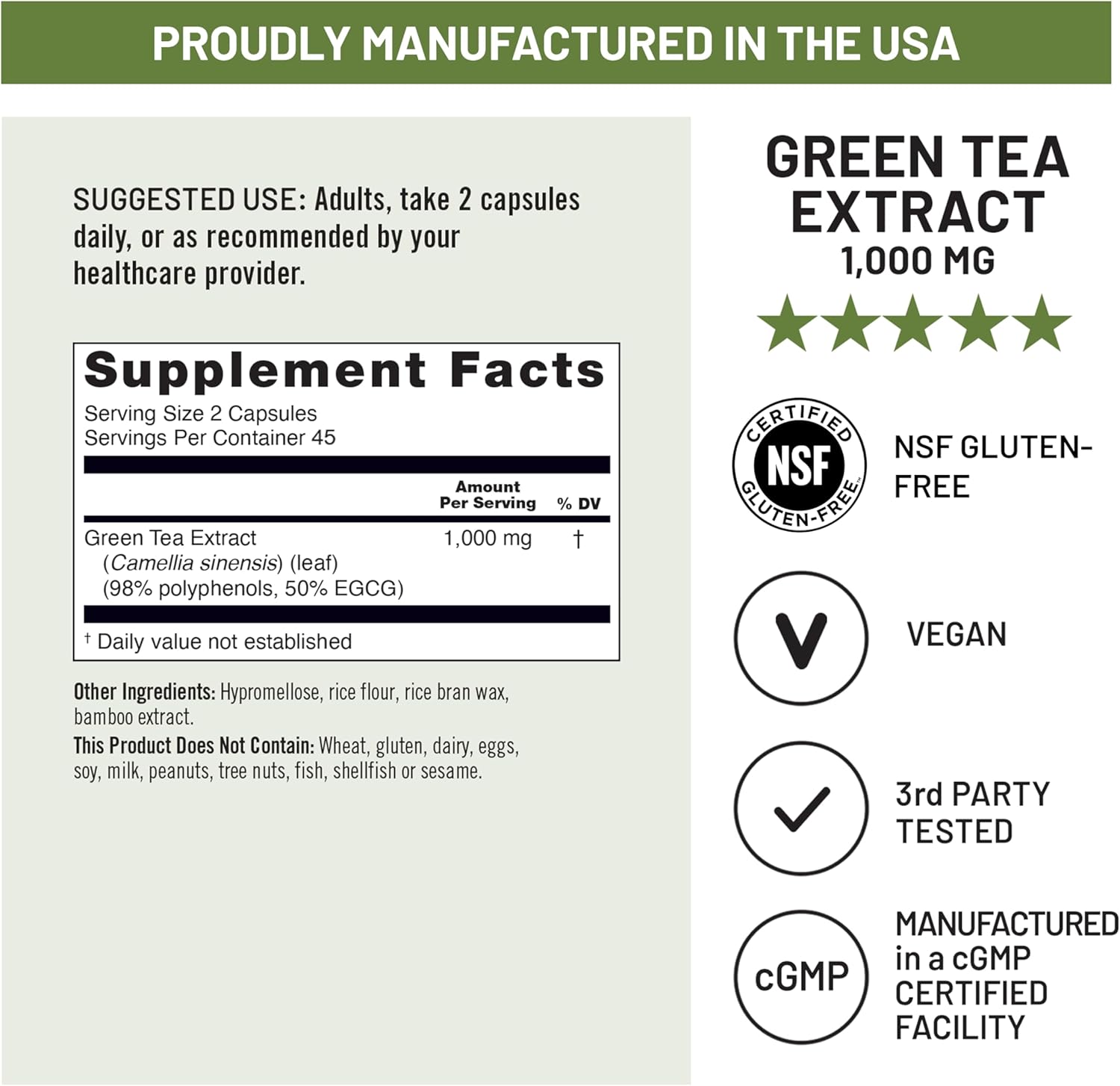 EXTRA STRENGTH GREEN TEA EXTRACT: Our green tea extract capsules are made with clean, highly concentrated green tea extract at an extra strength dose of 1000 mg of green tea extract per serving of 2 capsules.