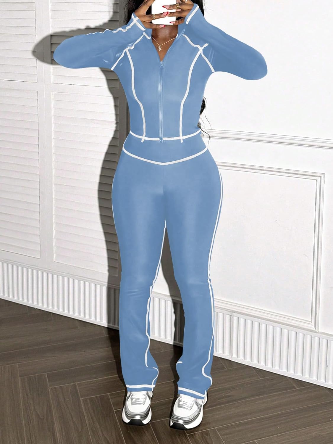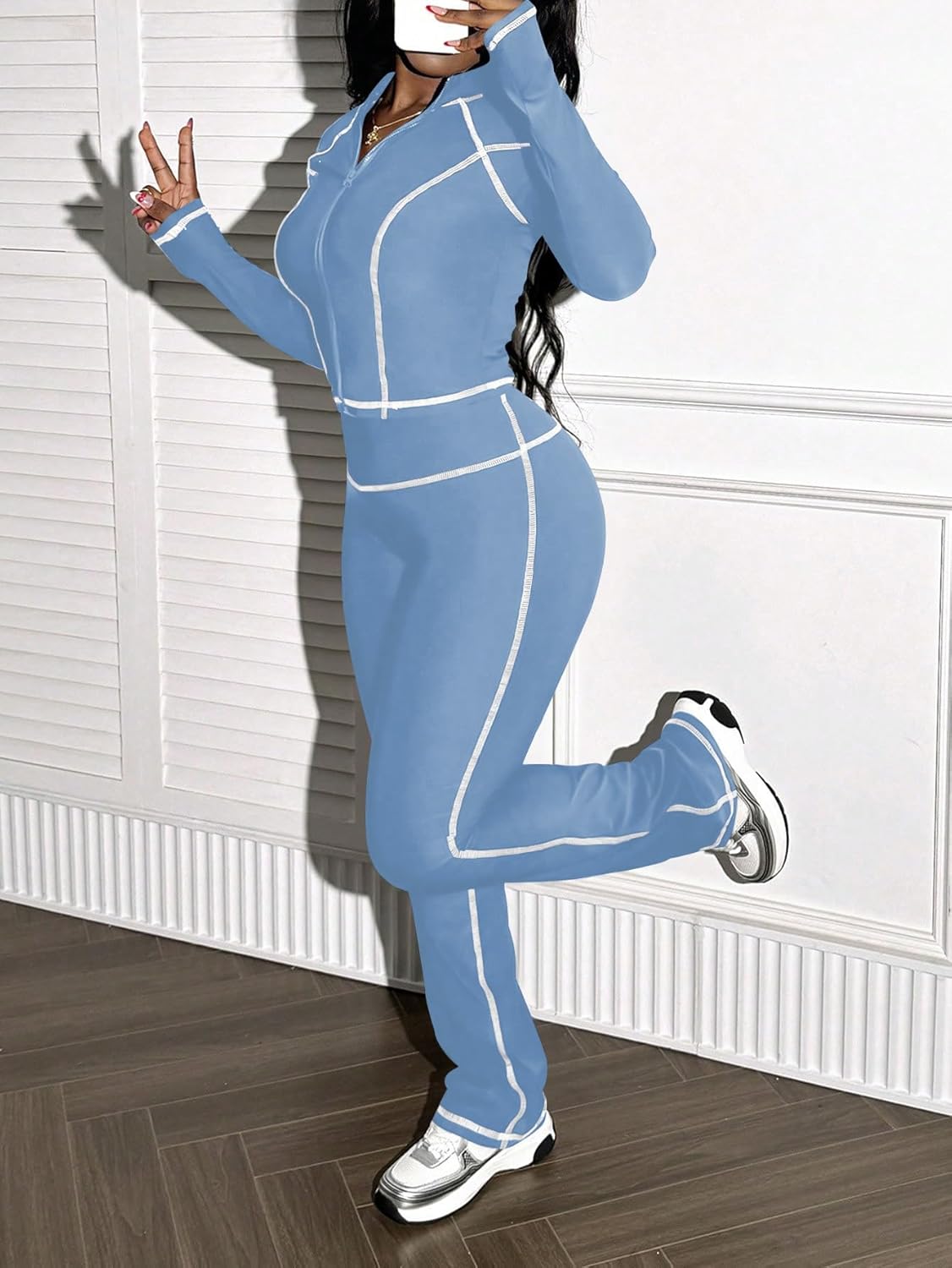 This little track suit is nice. The fabric is soft and stretchy and it’s not too tight and not too loose. I wore it yesterday with a tank top underneath regular undergarments and it looked great. It’d look even better with some shape wear under it. Great to pair with a pair of tennis shoes. The zipper worked well wmand had no issues and the seams(since they’re white and the set is blue) are appropriately placedand really make the outfit what it is. The bottoms could be a little longer for me, but I’m 5 ft. 9in. . The pants do come right at the top of the foot so they should be fine as long as I don’t dry them. I was told the outfit looks good by several different people while wearing it. The quality seems to be okay especially considering the price. I didn’t know what to expect for the price and honestly it looks like it’s worth a lot more. A two piece set for the price asked is amazing. The fact that there are several different color choices is pretty great too. It’s awesome to me that people can find affordable clothing that still looks good. If you’re looking for a nice workout outfit for a great price this one is it. This one is more than capable of fulfilling that need and more. It contours the body well and hugs amin the right spots. The waits is in perfect placement as well. These bottoms made me look like I had legs for days and the outfit looked like it was made for me. The only thing that would be better is if the pants were just a smidge longer and if the top had thumb holes in it. All in all it’s a great set for a great price.