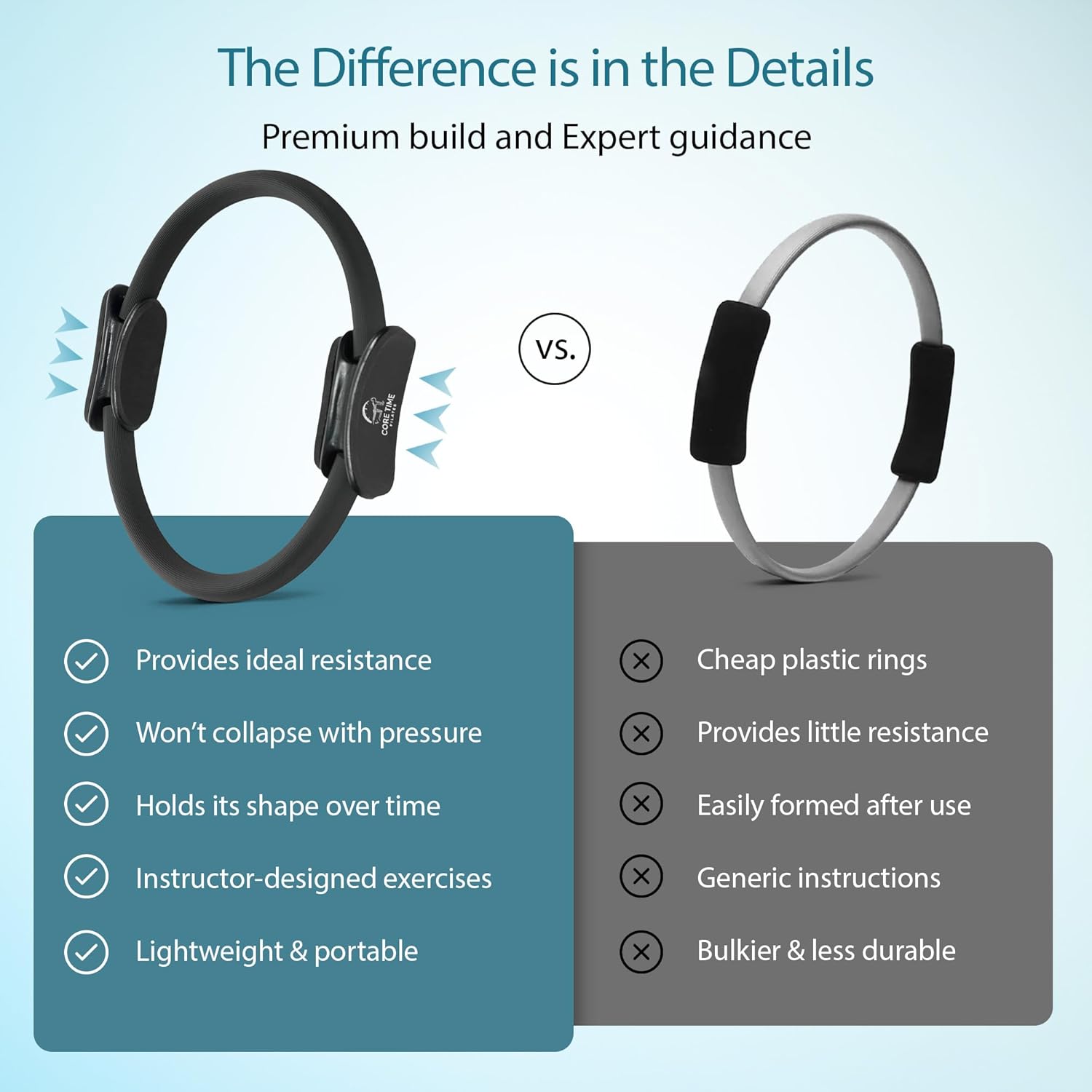 WEBSITE SUPPORTED- INSTRUCTOR GUIDED PILATES WORKOUT WITH THE CIRCLE RING: Pilates Fitness Circle and Exercise Guide are designed by a Certified Instructor for daily use. A Workout Guide includes 25 exercises with QR codes to view on a mobile device to watch a short video of the exercise in action. Website supported with additional videos and materials. The perfect Pilates Set to increase flexibility, strength, resistance, and balance.