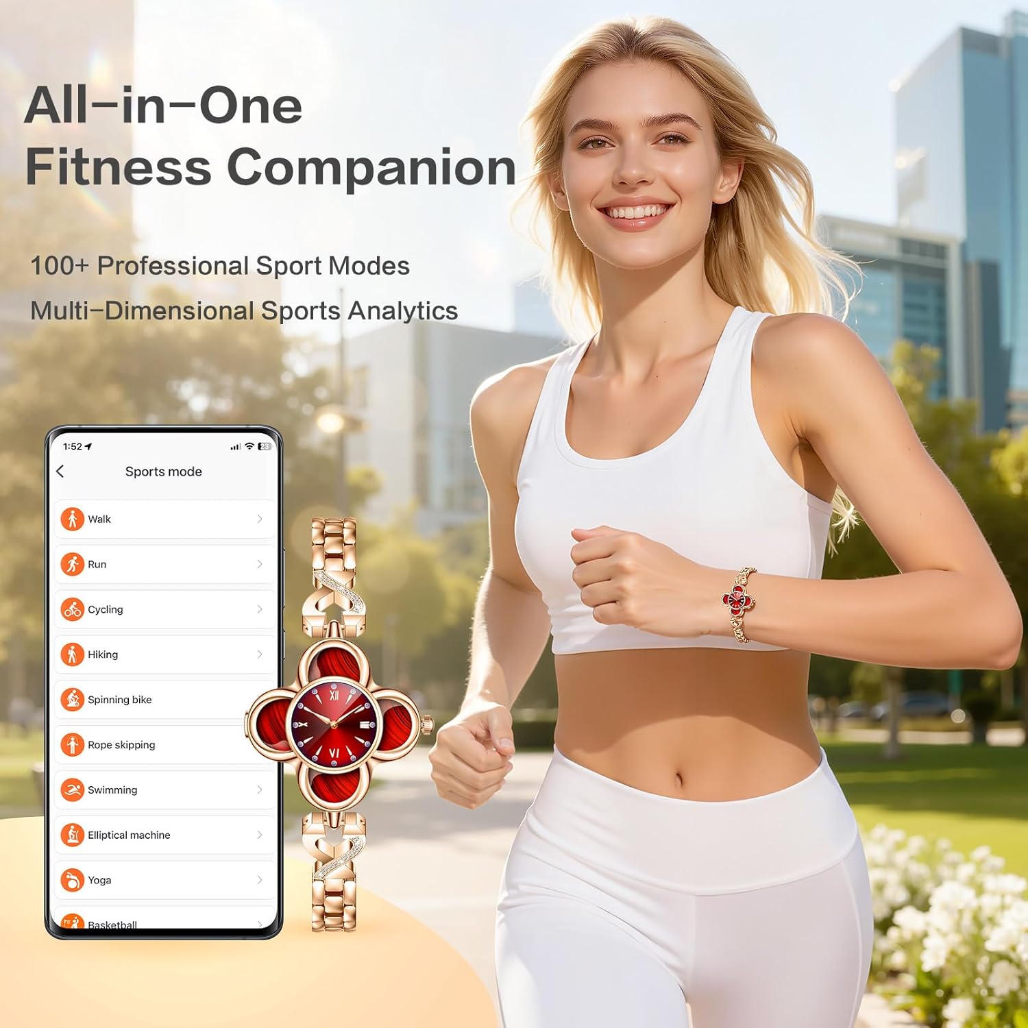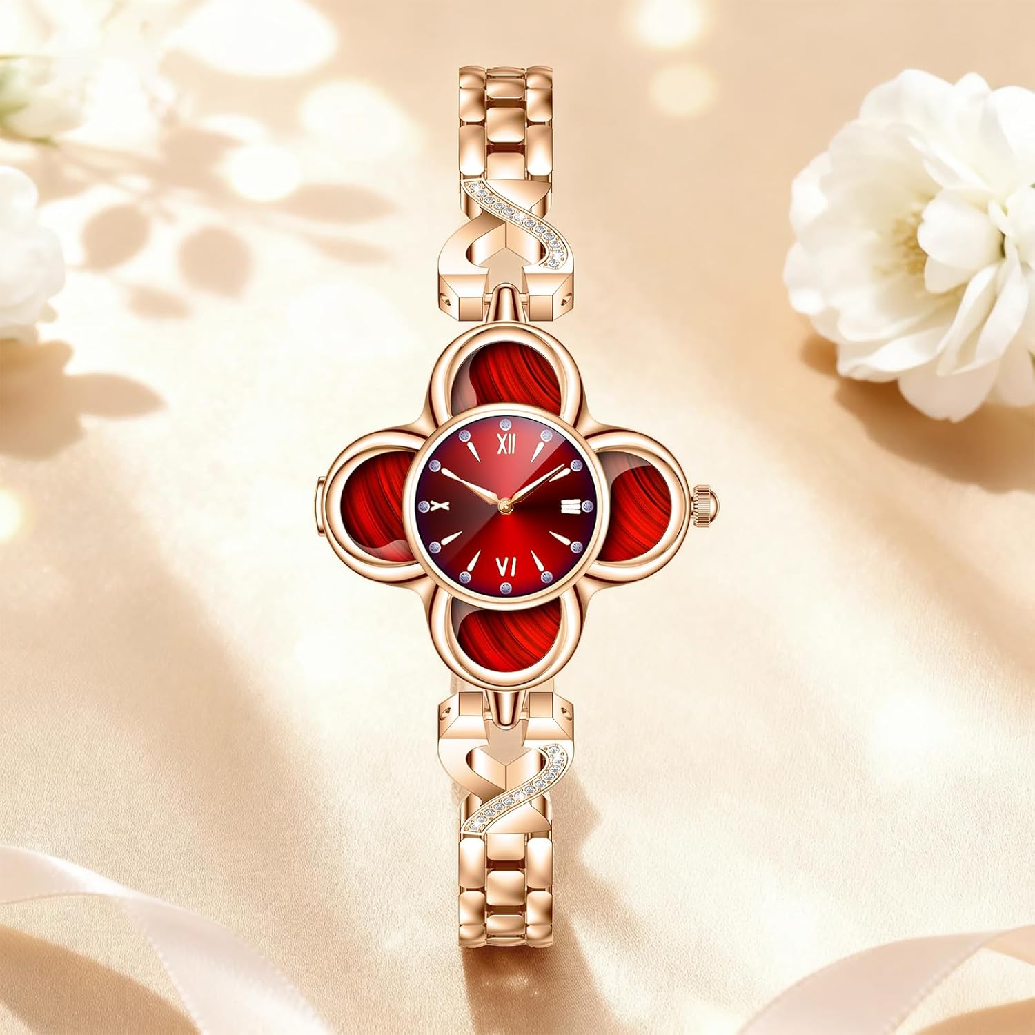 Red Clover Design Smart Watch for Women, Elegant Quartz Fitness Tracker with 24/7 Heart Rate SpO2 Monitor, Sleep Tracking, IP68 Waterproof Smart Bracelet, Message Notifications for Android iPhone
