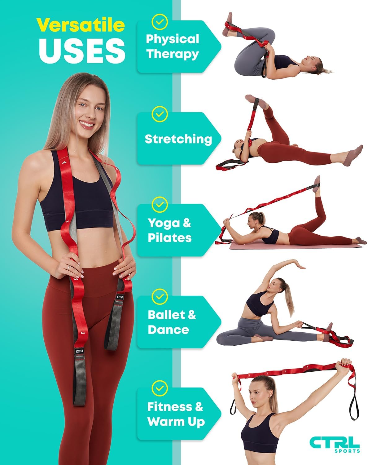 Do It All Strap: From leg stretcher to hamstring stretcher, our stretching bands do it all. Great for yoga and fun workouts!